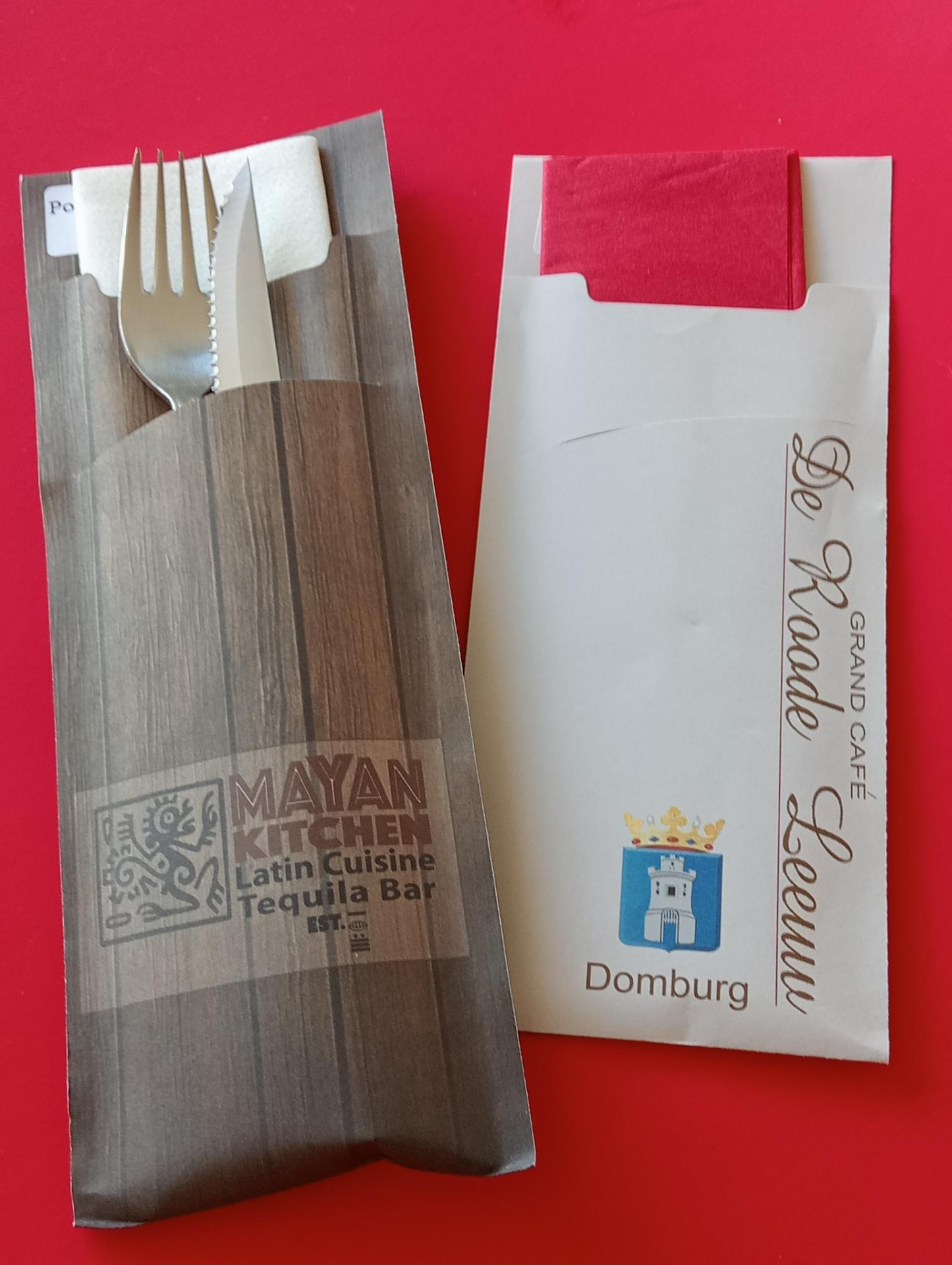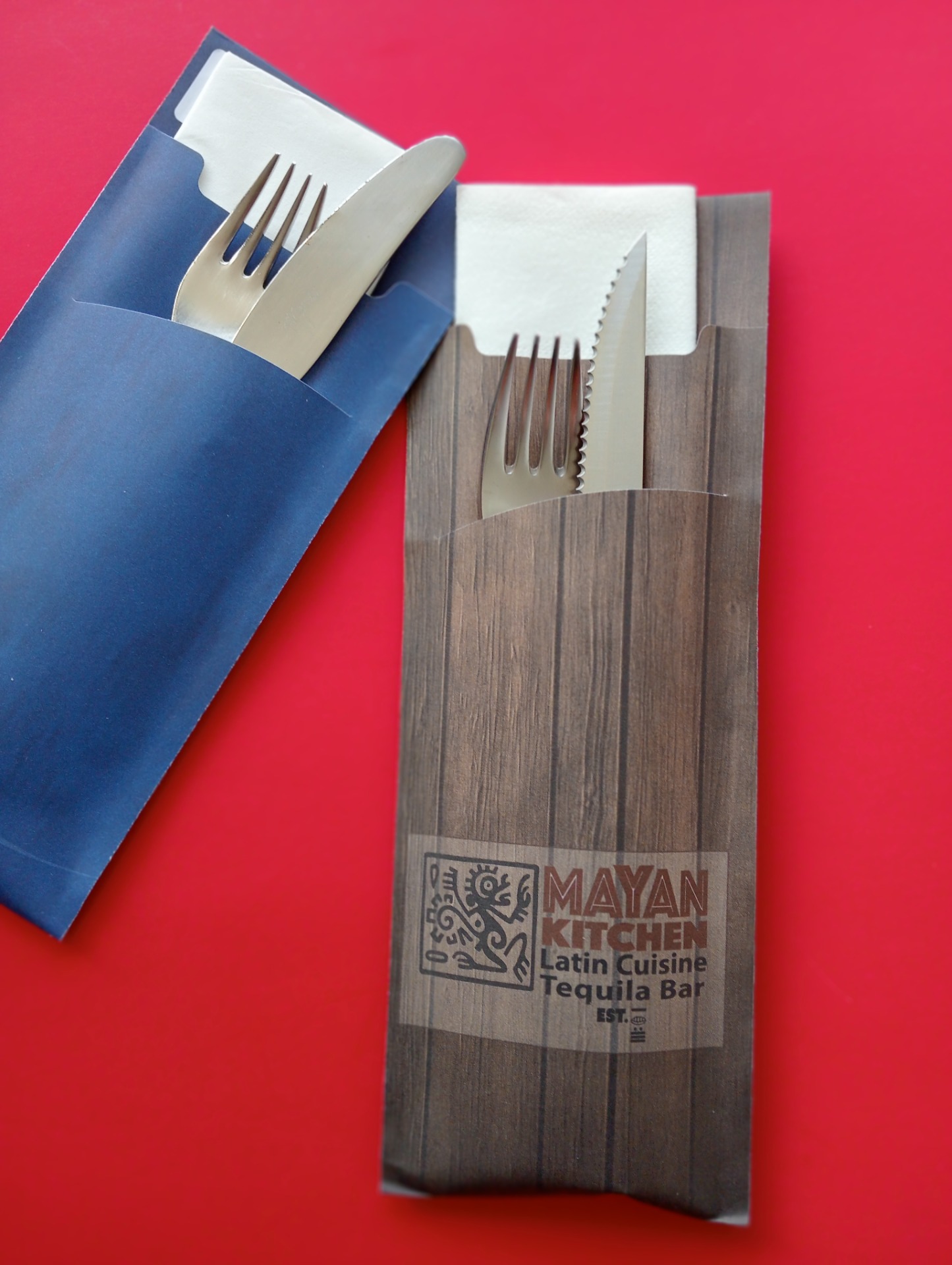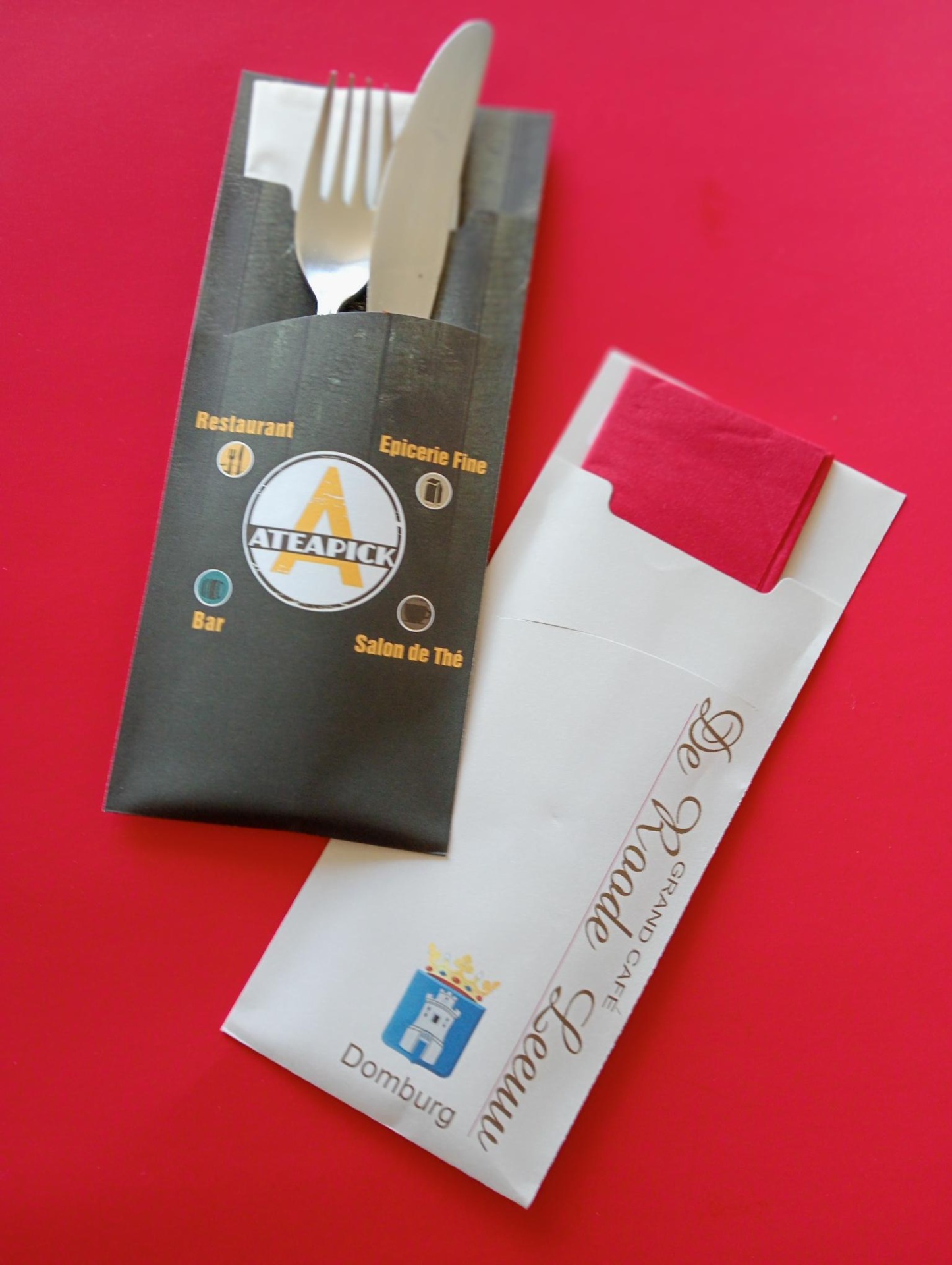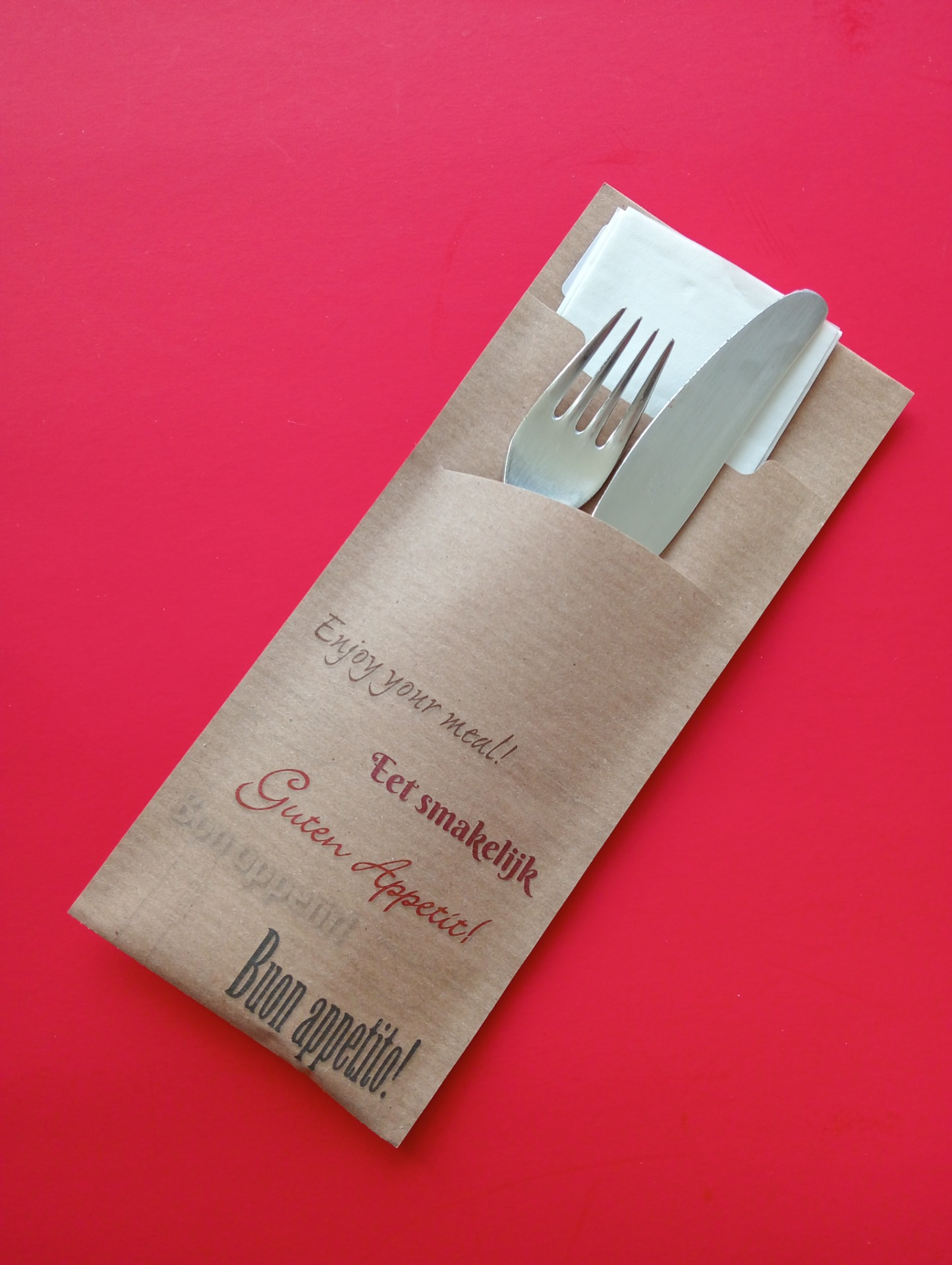 Bestekhoes in het formaat 200x85 mm. Full colour bedrukt en voorzien van papieren (2-laags) servet. Formaat servet 33x33 cm